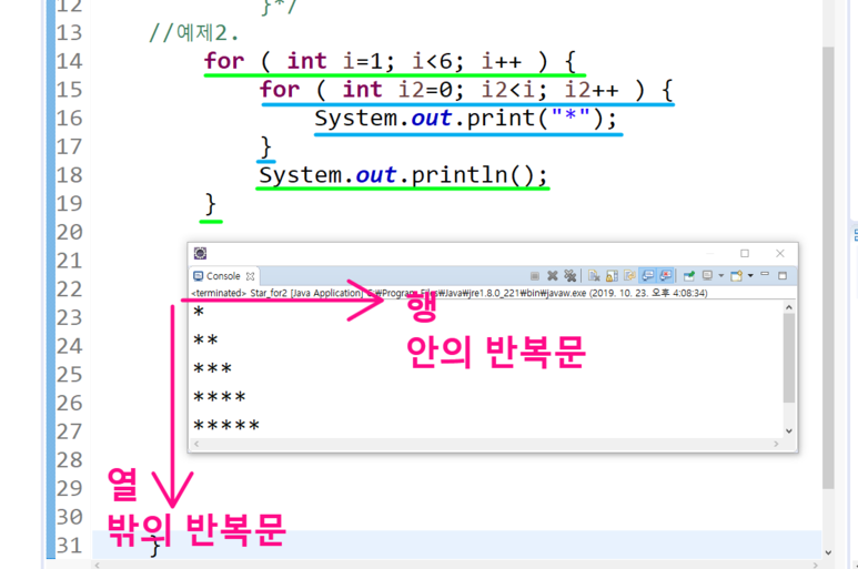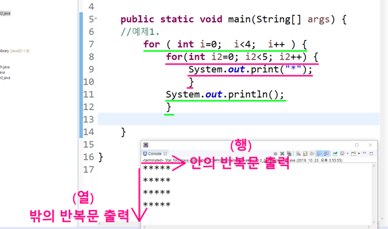 그 안의 반복문은 "*"을 5개씩 출력하는 역할을 하고 있다.