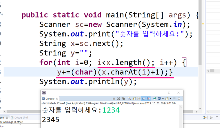 무엇을? { y+=(char)(x.charAt(i)+1); }를