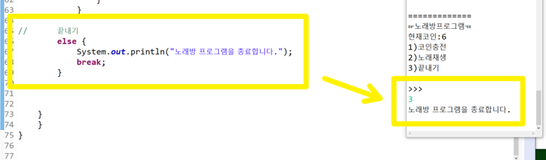 System.out.println("1) 코인 충전\n2) 노래 재생\n3) 끝내기");