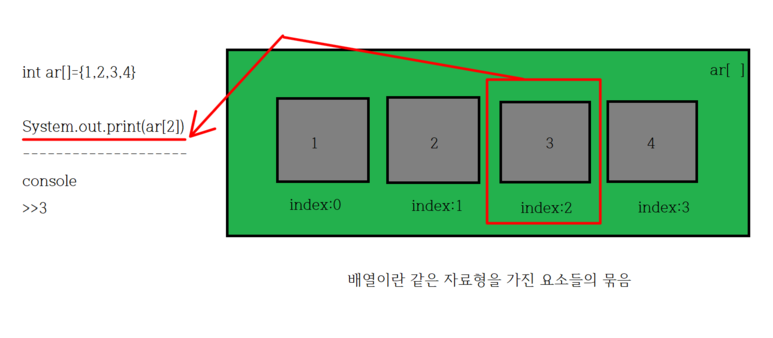 System.out.print(배 열명[ 묶음의 인덱스 번호] [요소의 인덱스 번호 ]);