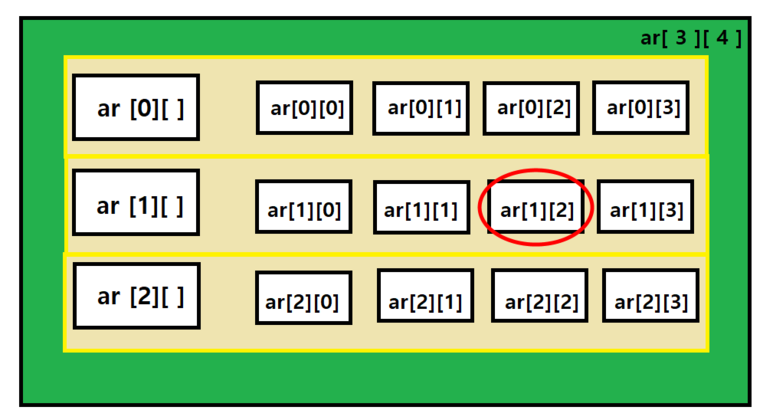ar [ 3 ][ 4 ]라는 것은 이중 배열이며 3개의 밖의 배열이 있고
