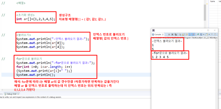 구조:System.out.println( 배 열명 [ 인덱스 번호 ] );