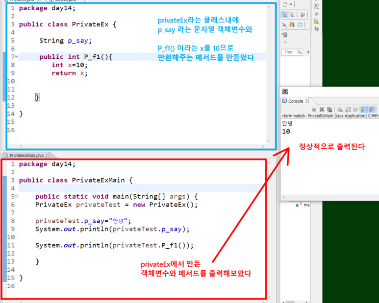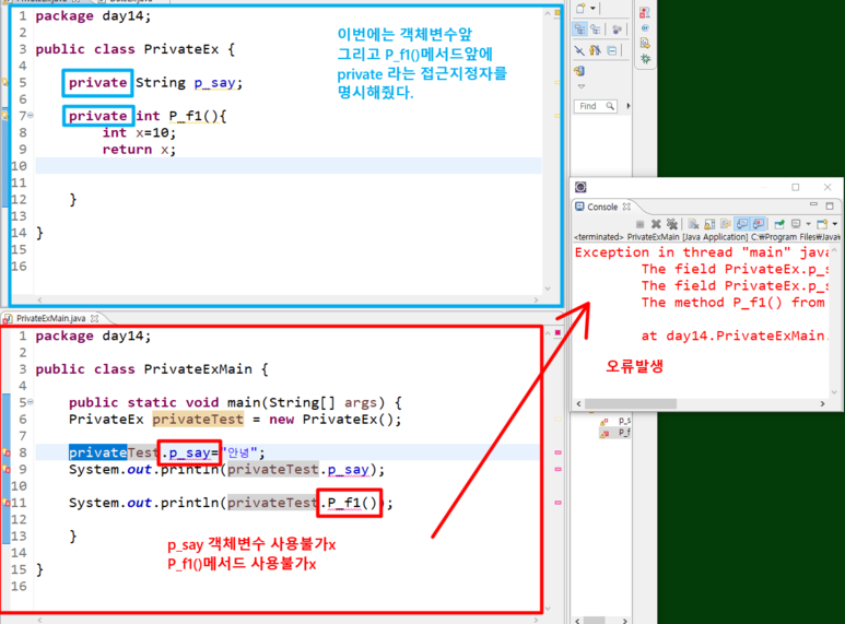 이번엔 객체 변수 앞, 메서드 앞에 private 접근 지정자를